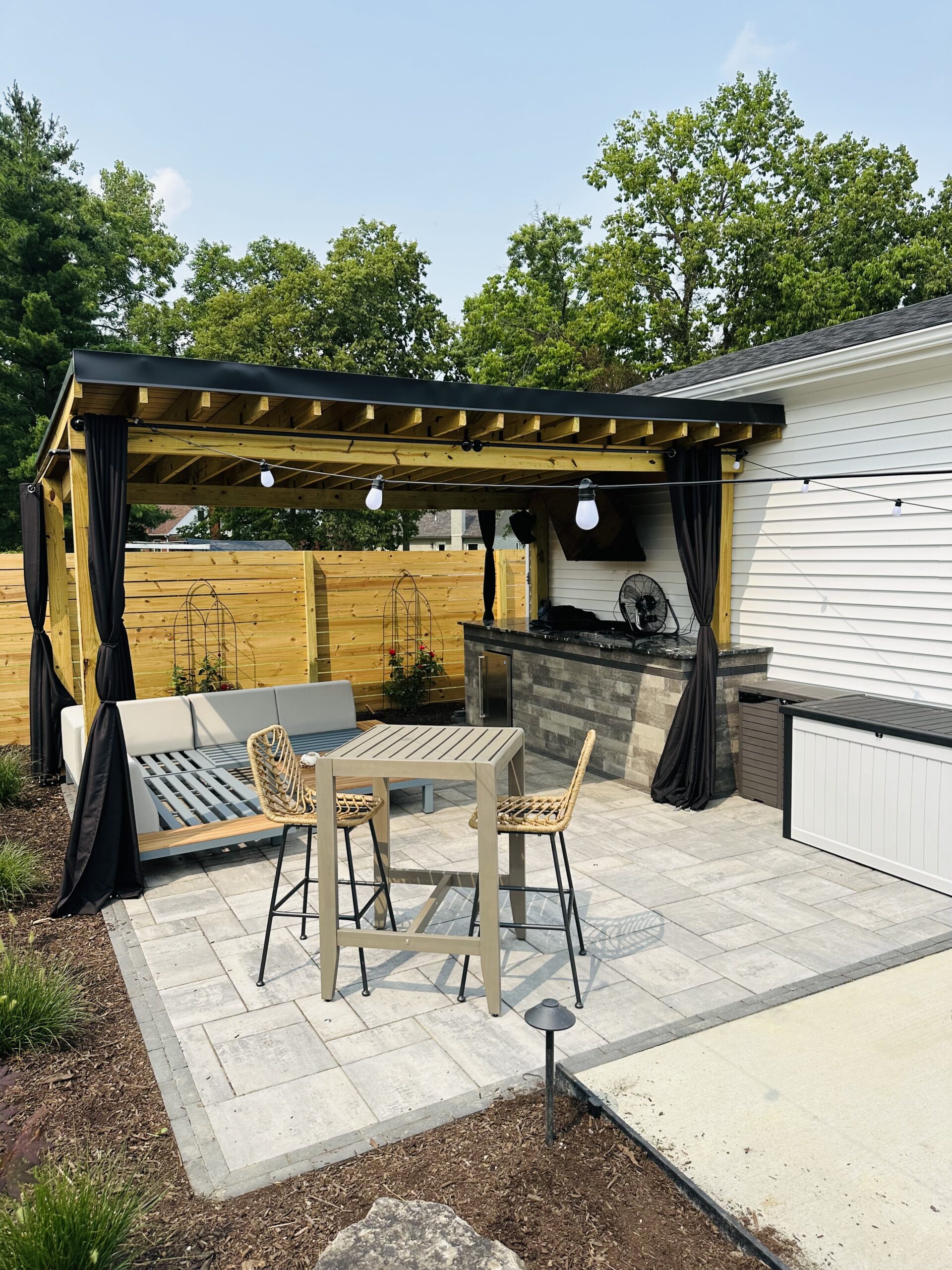 For outdoor kitchens design, we partner with certified licensed plumbing professionals to safely run all necessary utilities, ensuring seamless integration of grills, sinks, and appliances. We enhance ambiance with elegant gas fire pits that create cozy gathering spots year-round, while our pergolas offer customizable options. Our pergolas can be built with pressure-treated wood or beautiful rough-sawn cedar, complete with automated features, and add-ons like standing seam metal roofs for covered comfort.
